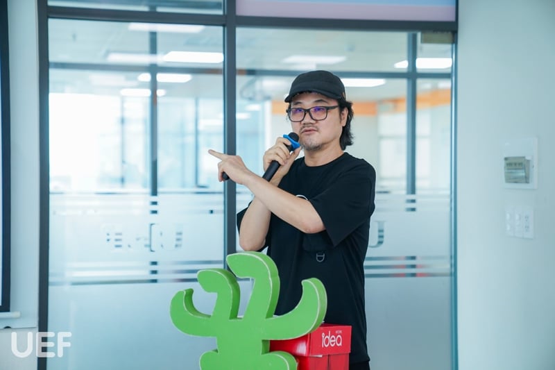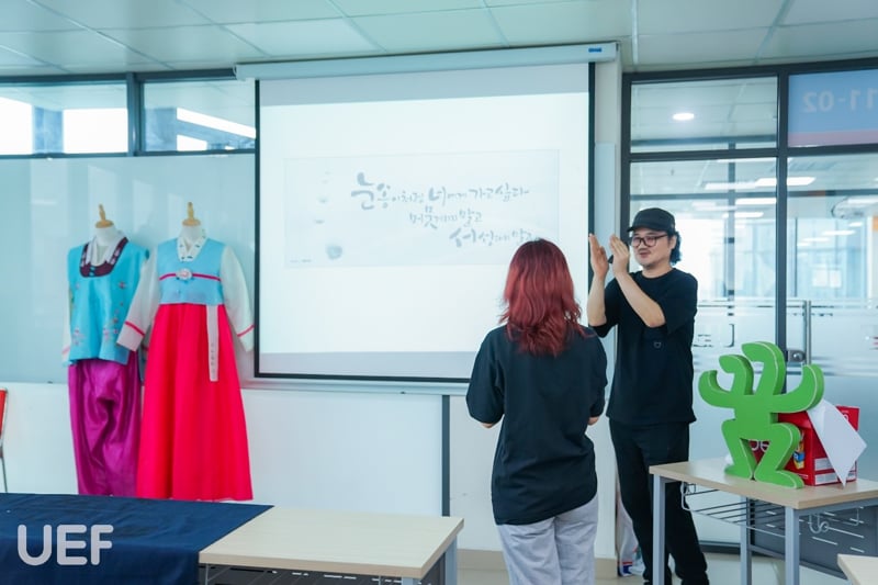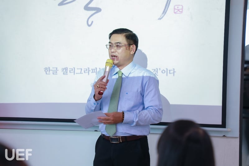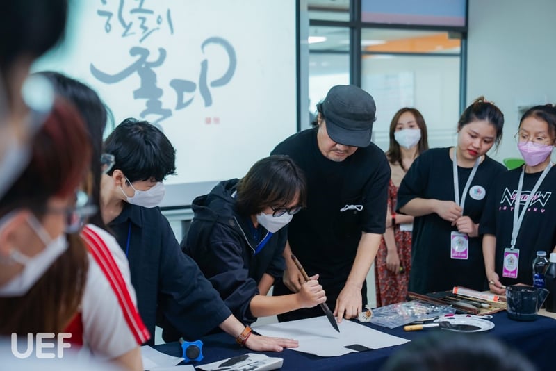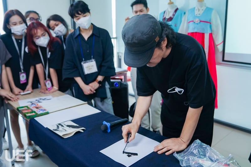 Để giúp sinh viên UEF hiểu rõ hơn về nghệ thuật viết thư pháp, nghệ nhân Park Byung Chul đã có những chia sẻ chi tiết về lịch sử, ý nghĩa, bố cục, kỹ thuật dùng bút và cách bày trí văn tự của thư pháp Hàn Quốc. Nghệ nhân còn cho biết thêm: “Thư pháp không giới hạn ở việc chỉ cầm bút lông để vẽ mà nó đi vào vấn đề thị giác. Do đó, thư pháp tương tác với nghệ thuật phương Tây, tương tác với nghệ thuật của Á Đông và đưa ra một hướng riêng không phụ thuộc vào đường nét của con chữ.”