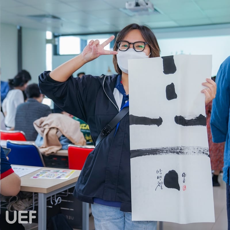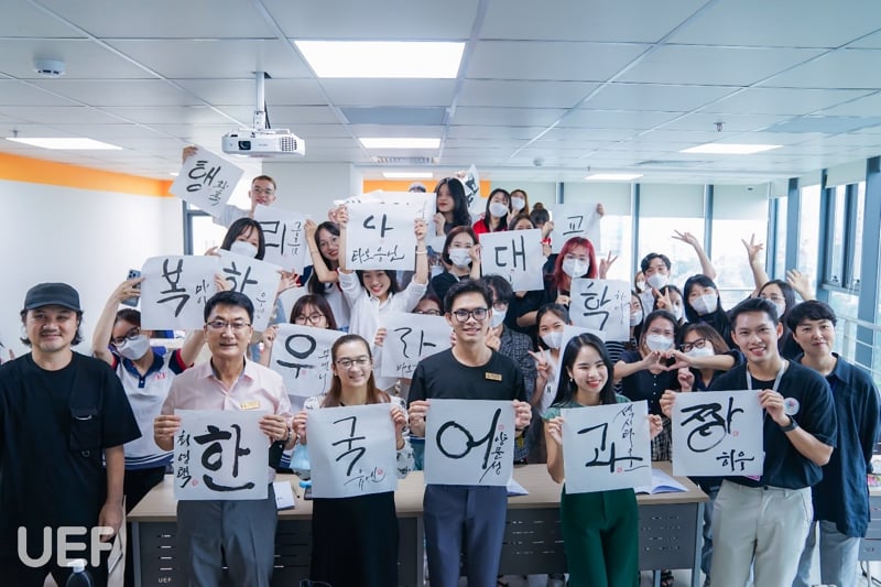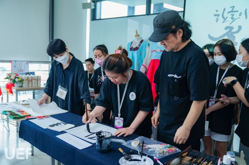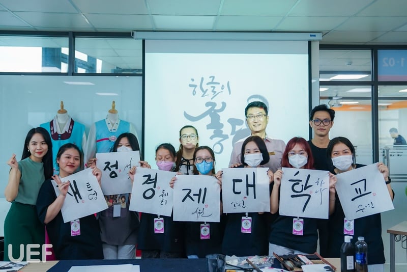 Nhằm giúp cho các bạn sinh viên Nhà UEF tìm hiểu thêm về ngôn ngữ Hàn Quốc cũng như chữ viết, cách thức viết và vẻ đẹp của nó, chiều ngày 27/9, Khoa Ngôn ngữ và Văn hóa quốc tế UEF phối hợp với Hangeul Planet tổ chức chương trình “Hangeul Calligraphy – Viết thư pháp Hàn Quốc”.