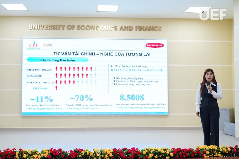 Ở góc độ doanh nghiệp, bà Bùi Thị Thuỷ đã giới thiệu tổng quan về Dai-ichi Life Việt Nam và các cơ hội nghề nghiệp dành cho sinh viên. Thông tin về môi trường làm việc, lộ trình phát triển và cơ hội trải nghiệm thực tế ngay từ khi còn trên giảng đường đã mở ra cho UEFers nhiều định hướng nghề nghiệp thiết thực.