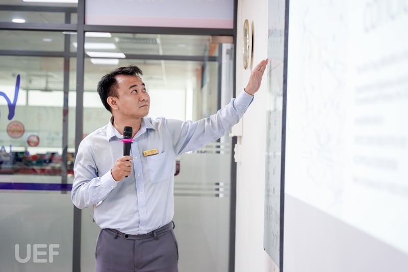 Không chỉ lắng nghe, sinh viên Nhà UEF còn được tương tác cùng diễn giả. Tại đây, các nhóm đã lần lượt trình bày thắc mắc về những vấn đề mà mình gặp phải trong quá trình nghiên cứu để nhận góp ý từ thầy.