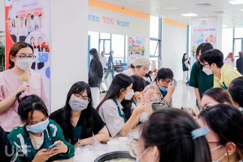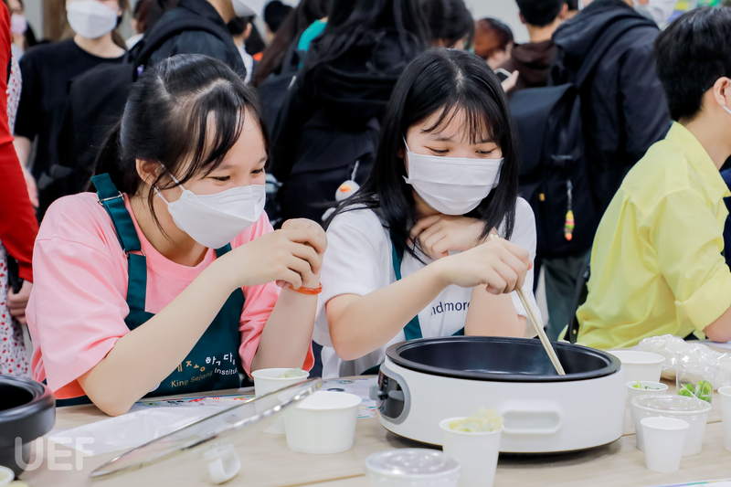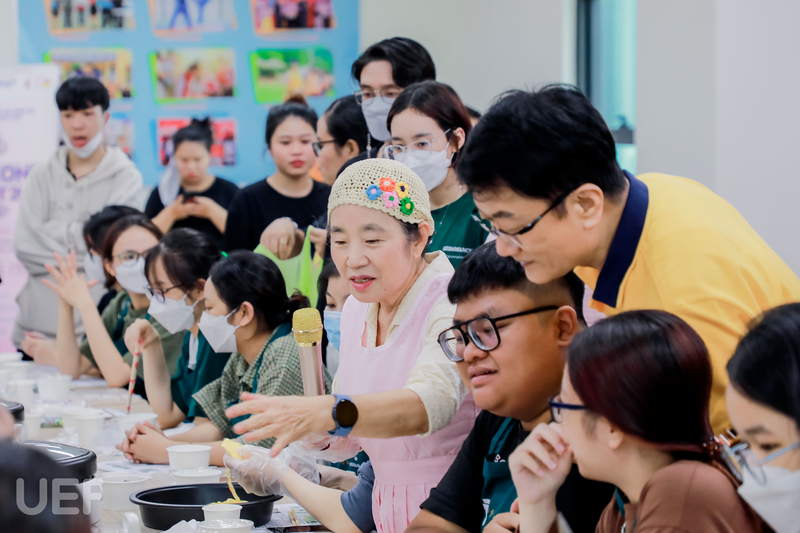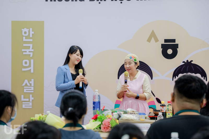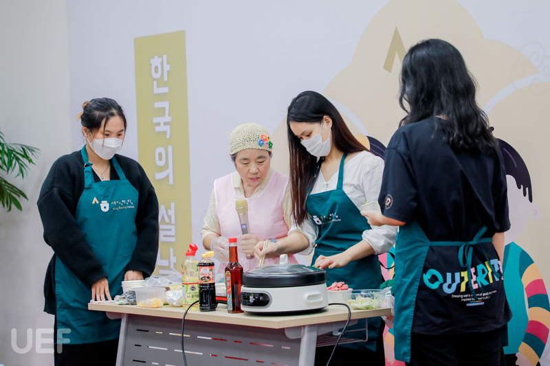 Dưới sự dẫn dắt của chuyên gia ẩm thực Hàn Quốc - cô Song Jea Up và ThS. Phạm Thị Thùy Linh – Phó Trưởng Khoa Ngôn ngữ và Văn hóa quốc tế, các bạn sinh viên UEF đã được tìm hiểu về ý nghĩa, giá trị của món ăn Tteokguk. Đặc biệt, các bạn còn được hướng dẫn thực hành làm món ăn này và thưởng thức thành quả do chính mình làm ra.