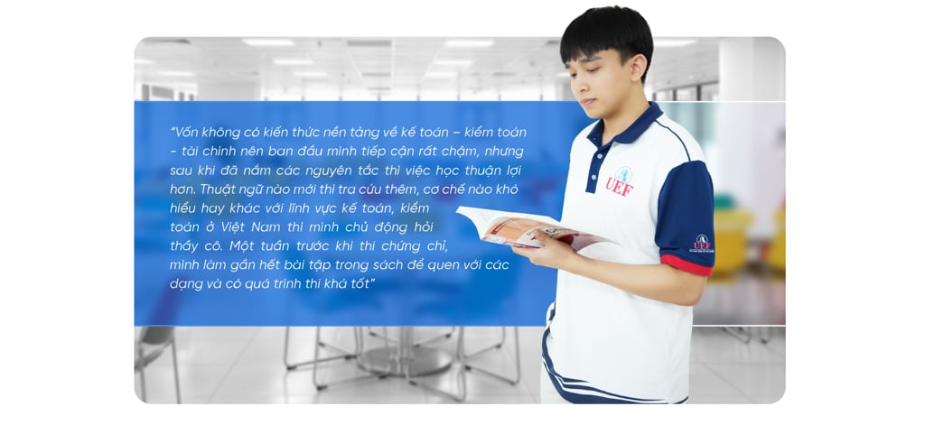 Từng tạm hoãn “giấc mơ giảng đường” sau một năm vào đại học vì chưa định hướng rõ ràng về tương lai, bạn Võ Lê Hoan, sinh viên khóa 2022 ngành Kiểm toán, Khoa Tài chính - Kế toán tại UEF giờ đây đã xác định được thế mạnh của bản thân, đạt chứng chỉ về kế toán - kinh doanh của Hiệp hội Kế toán Công chứng Anh Quốc (ACCA) và tiếp tục hành trình chinh phục mục tiêu nghề nghiệp.