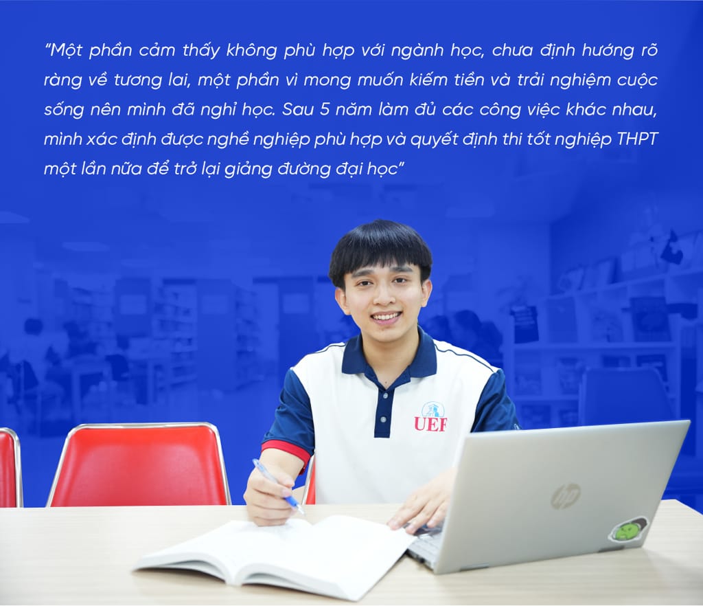Giao hàng, lễ tân, bán hàng online… là một số công việc mà Lê Hoan liệt kê khi nhớ về thời gian sau khi thôi học. Cậu sinh viên 26 tuổi từng tốt nghiệp THPT vào năm 2016 và học một năm tại trường đại học ở TP.HCM trước khi xét tuyển ngành Kiểm toán của UEF vào năm 2022. ![]() Bắt đầu lại có lẽ là lựa chọn khó khăn đối với nhiều người, đặc biệt là các bạn trẻ đứng trước mục tiêu nghề nghiệp và hướng đi trong tương lai. Trường hợp của Lê Hoan không phải là ngoại lệ khi bạn phải nhiều lần “tự vấn”. ![]() Theo lời kể của Lê Hoan, vào cuối năm 2021, khi đọc được một số bài viết trên trang Spiderum (trang web chia sẻ kiến thức, kinh nghiệm và góc nhìn đa chiều của người trẻ ở Việt Nam) về chứng chỉ ACCA và kiểm toán, bạn nhận thấy đây là nghề có định hướng rõ ràng và bản thân có tố chất phù hợp nên quyết định lựa chọn.