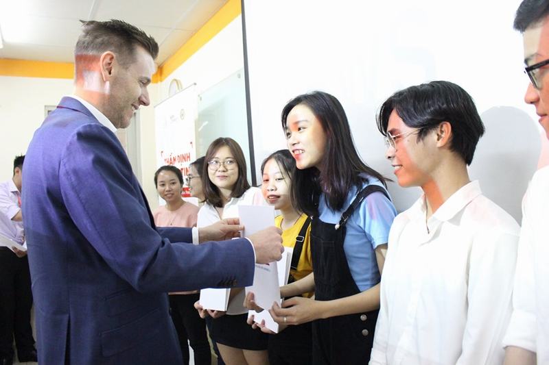 Ông Matthew Ference trao giấy chứng nhận cho các bạn sinh viên hoàn thành khóa học