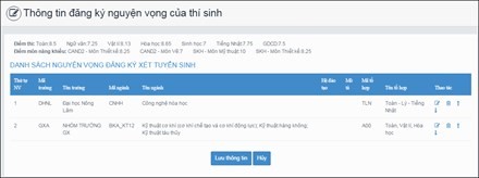 - Màn hình chức năng Thông tin đăng ký nguyện vọng của thí sinh được hiển thị: