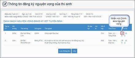 Rê chuột vào màn hình Sửa nguyện vọng, thí sinh nhấn nút “Chỉnh sửa nguyện vọng”