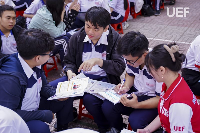 Các bạn học sinh tìm hiểu thông tin và đăng ký xét bổng sớm tại UEF để nâng cao cơ hội vào đại học