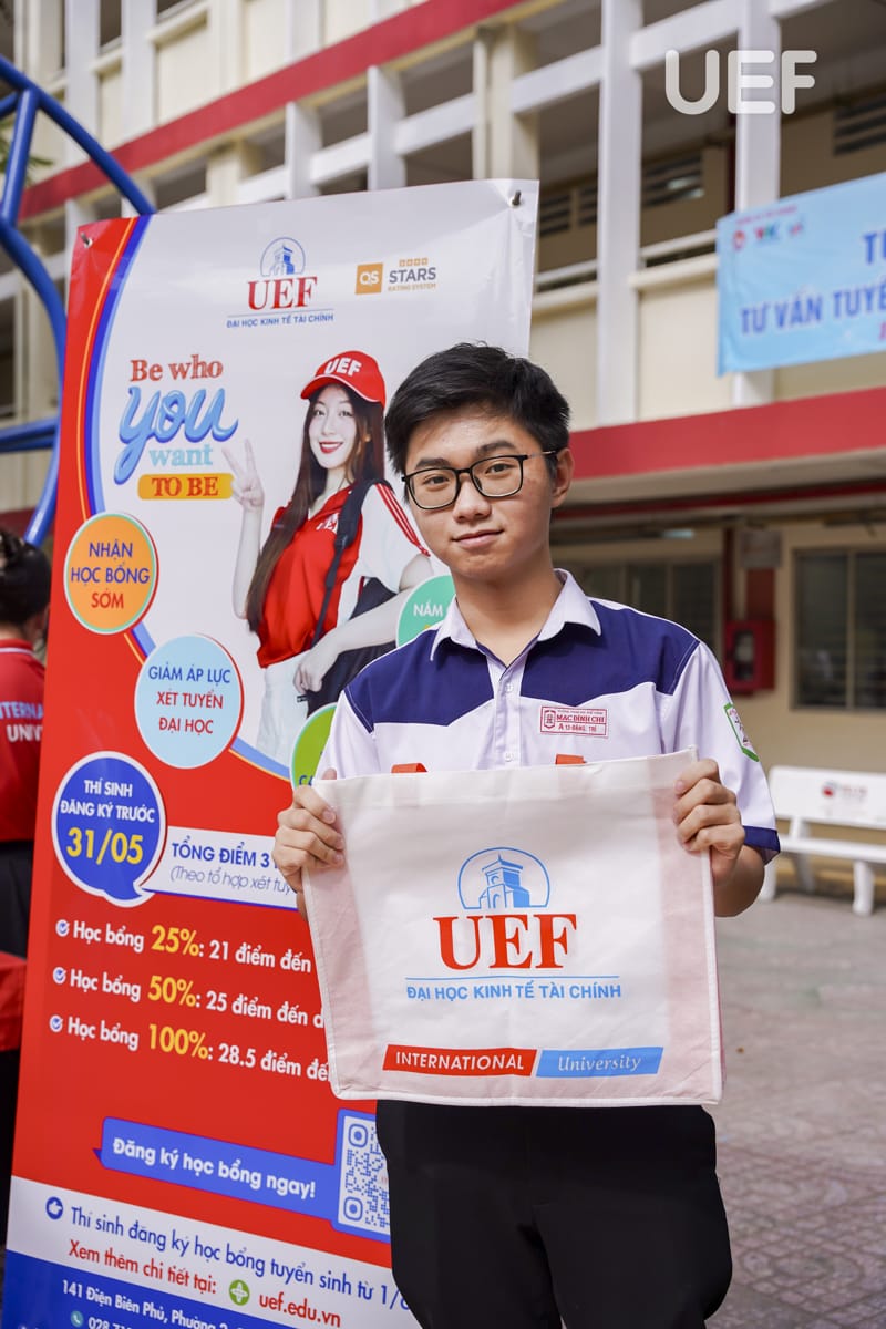 Trong khi đó, bạn Phạm Ngọc Hải Yến - Lớp 12A13 cho biết: “Sau khi tìm hiểu thông tin, em cảm thấy môi trường học tập, thầy cô và sinh viên ở UEF rất thân thiện. Em quan tâm ngành Kinh doanh quốc tế của trường, ngoài ra với lợi thế tiếng Anh khi đạt IELTS 6.0 thì chương trình song ngữ của UEF rất phù hợp nên em đã đăng ký xét học bổng sớm vào trường”.