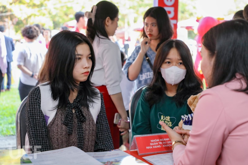 Xu hướng đăng ký ngành học tại UEF khá đồng đều khi gian tư vấn các lĩnh vực từ kinh tế, kinh doanh, tài chính, công nghệ thông tin cho đến dịch vụ, truyền thông, tâm lý, ngôn ngữ,… đều chào đón đông đảo học sinh đến tìm hiểu. Các thầy, cô của Nhà trường đã tư vấn tận tình về phương thức xét tuyển, chính sách học phí, học bổng, chương trình đào tạo, thông tin ngành học, cơ hội việc làm cho các bạn.