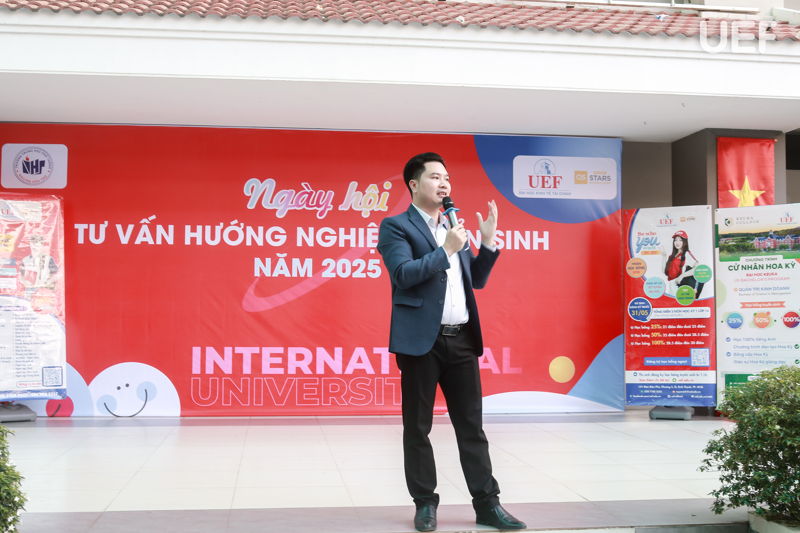 Tiếp nối, ThS. Vương Văn Khởi - Phó Giám đốc Trung tâm Tư vấn - Tuyển sinh UEF đã trực tiếp giới thiệu đến học sinh những thông tin nổi bật về kỳ tuyển sinh năm 2025 của Nhà UEF như các phương thức xét tuyển linh hoạt, chính sách học phí ổn định đi cùng học bổng hấp dẫn và giá trị, chương trình đào tạo song ngữ theo chuẩn quốc tế, môi trường học tập hiện đại, năng động với nhiều hoạt động ngoại khóa, giao lưu quốc tế,...