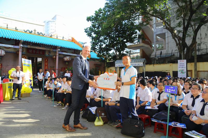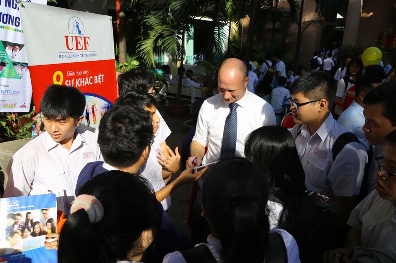 Đáng chú ý, học sinh THPT Trần Hữu Trang còn có dịp tiếp xúc trực tiếp, tự tin trao đổi tiếng Anh cùng PGS. Casper Mortensen, hiện là Trưởng đại diện của UEF tại khu vực châu Âu. Vị chuyên gia đến từ Đan Mạch này đã tận tình tư vấn chuyên sâu về môi trường học tập quốc tế tại UEF, về kỹ năng tiếng Anh thực hành, những hành trang cần thiết để theo học chương trình song ngữ cũng như quốc tế tại trường. Cạnh đó, các bạn cũng được giải đáp cặn kẽ về sự khác biệt trong phương pháp học tập tại Việt Nam và Đan Mạch - quê hương thầy Casper.