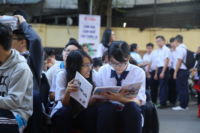 Học sinh THPT Trần Hữu Trang tìm hiểu thông tin ngành học qua sổ tay tuyển sinh UEF