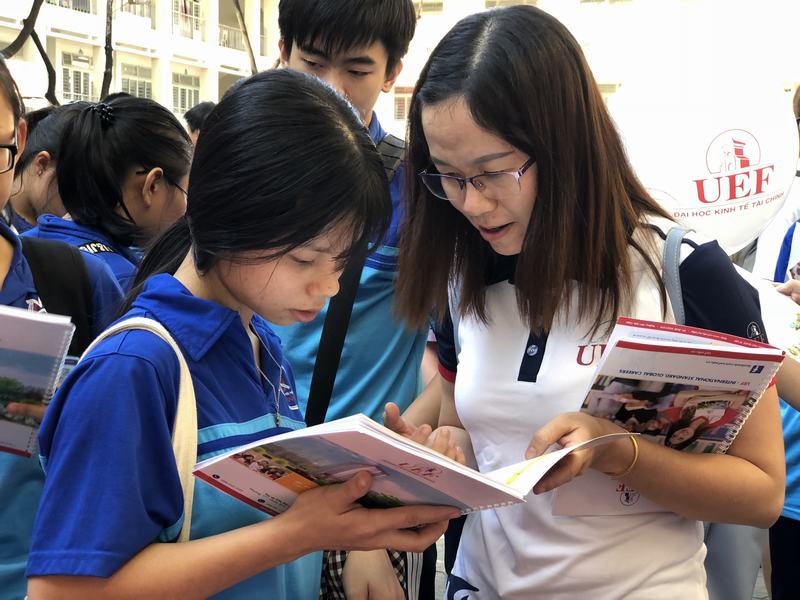 Gian hàng UEF thu hút nhiều bạn học sinh đến tìm hiểu về các phương thức tuyển sinh cũng như ngành đào tạo và môi trường học tập tại trường