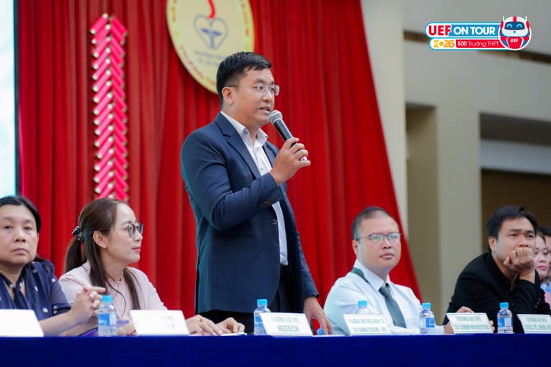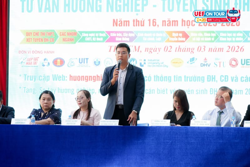 Bên cạnh chính sách học bổng sớm, đại diện Ban tư vấn UEF, ThS. Huỳnh Vũ Chi - Phó Giám đốc Trung tâm Tư vấn - Tuyển sinh cũng cập nhật thông tin mới nhất về phương thức xét tuyển đại học năm 2026 của trường, đồng thời giải đáp thắc mắc về các loại học bổng khác nhau khi thí sinh xét tuyển vào UEF.
