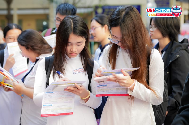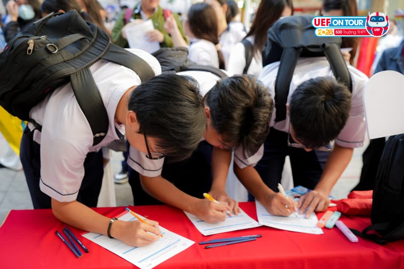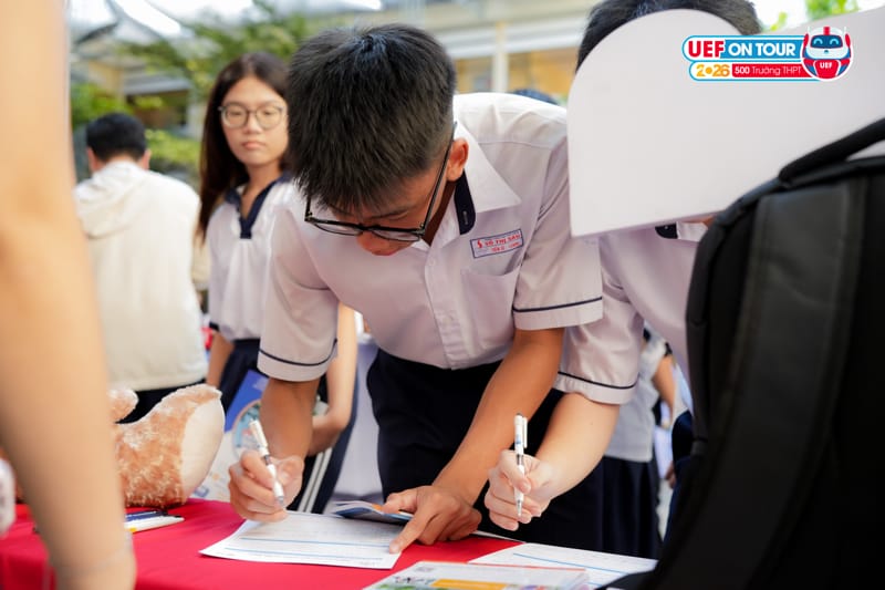 Trong chương trình Ngày hội tư vấn hướng nghiệp - tuyển sinh đại học, cao đẳng năm 2026 tại trường THPT Võ Thị Sáu sáng ngày 2/3, nhiều học sinh lớp 12 tìm đến gian tư vấn của UEF để đăng ký xét học bổng sớm sau khi tìm hiểu thông tin từ trước. Với điểm học bạ học kỳ 1 lớp 12, nhiều bạn tự tin đạt mức điểm học bổng sớm tại UEF.
