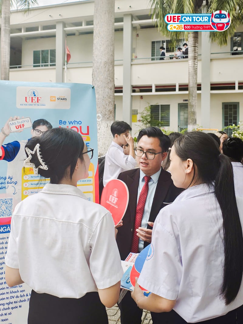 Tại ngày hội, UEF triển khai đồng thời hoạt động tư vấn chuyên sâu tại bàn và không gian tư vấn mở ngay tại sân trường, tạo điều kiện để học sinh dễ dàng tiếp cận thông tin. Các nội dung được đội ngũ tư vấn viên chia sẻ tập trung vào phương thức xét tuyển năm 2026, chính sách học phí, học bổng cũng như lộ trình học tập - nghề nghiệp phù hợp với từng nhóm ngành.