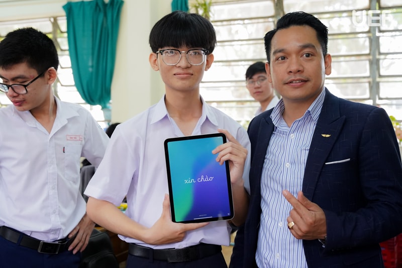 Bạn Lê Vũ Tân - học sinh lớp 12 Trường THPT Võ Trường Toản (Vĩnh Long) nhận iPad từ UEF