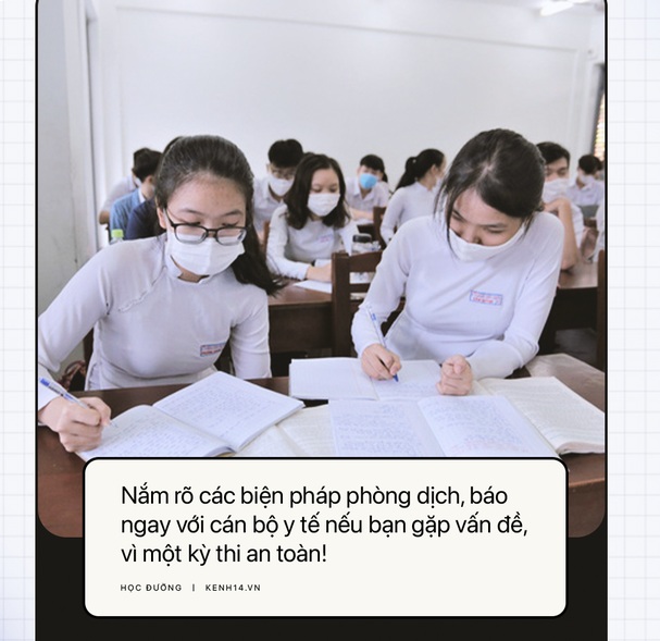 Đừng quên rằng, muốn thi cử thật tốt hãy để mình ở trạng thái tinh thần ổn định nhất có thể. Và điều quan trọng hơn cả là hãy chú ý giữ gìn sức khỏe, nhất là ở giai đoạn người người nhà nhà đang ra sức kêu gọi cùng nhau đẩy lùi dịch bệnh. Bạn sẽ là một chiến binh thực thụ nếu trong kỳ thi này, bạn biết giữ an toàn cho bản thân và cho người khác bằng những biện pháp phòng, chống dịch đã được hướng dẫn như đeo khẩu trang khi đi thi, sử dụng nước rửa tay, kiểm soát thân nhiệt và báo cáo ngay nếu gặp các vấn đề liên quan tới sức khỏe. Hãy cùng chung tay vì một kỳ thi an toàn, bạn nhé!
