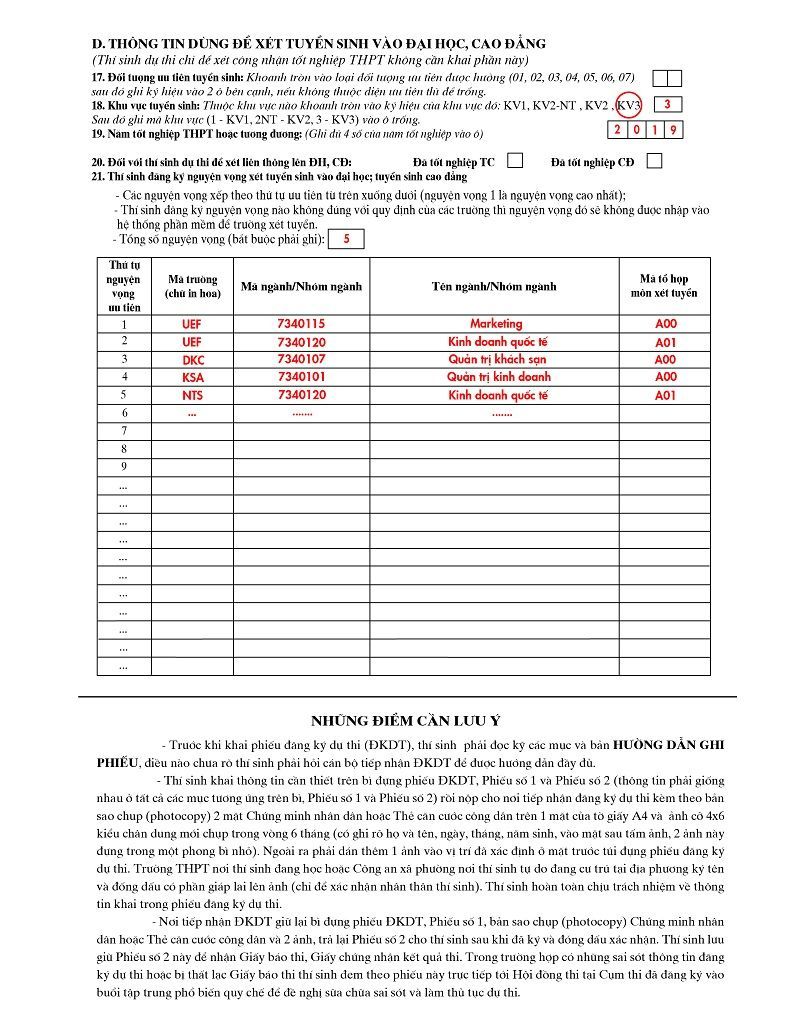 | Mục 17: Đối tượng ưu tiên tuyển sinh | Thí sinh tự xác định đối tượng ưu tiên, ghi đúng ký hiệu theo quy định. |