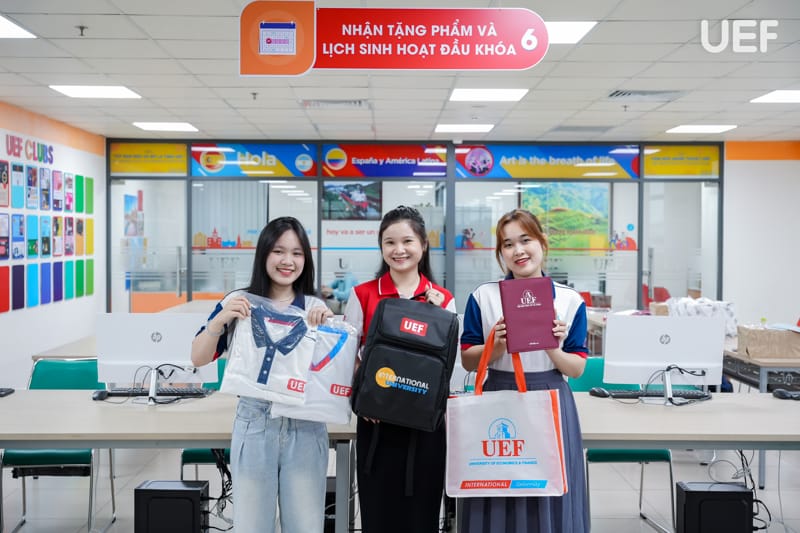 Nhà UEF đã chuẩn bị rất nhiều món quà đặc biệt để chào đón những “tân binh” khóa 2025. Trước khi hoàn thành quy trình nhập học, team 2k7 sẽ đến Khu vực 6 (tầng 6) để nhận những tặng phẩm như: balo, đồng phục thể dục, sổ tay sinh viên. Tại đây, các bạn cũng sẽ được nhận lịch sinh hoạt đầu khóa của mình.