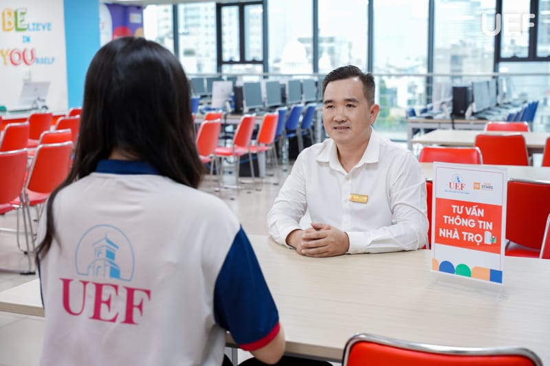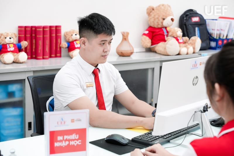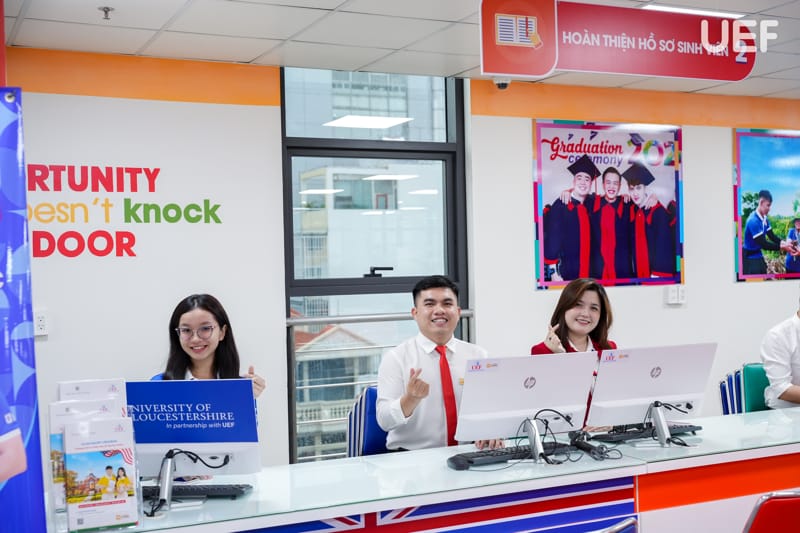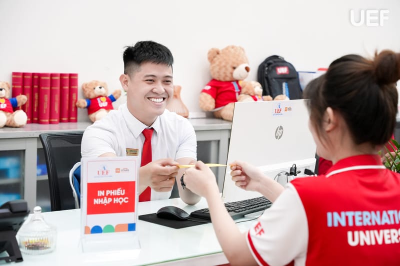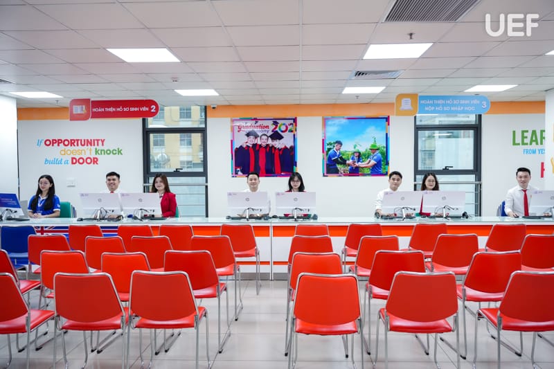 Khi thực hiện thủ tục nhập học tại UEF, đầu tiên, thí sinh cần đến Văn phòng Tư vấn - Tuyển sinh tại tầng 1 để được hướng dẫn các bước trong quy trình làm thủ tục bao gồm nhận phiếu thông tin nhập học, nhận bìa hồ sơ nhập học.