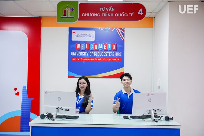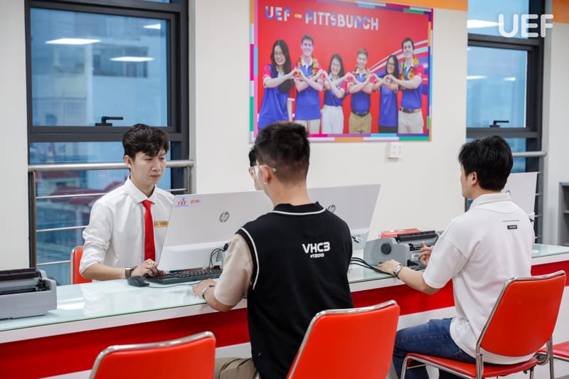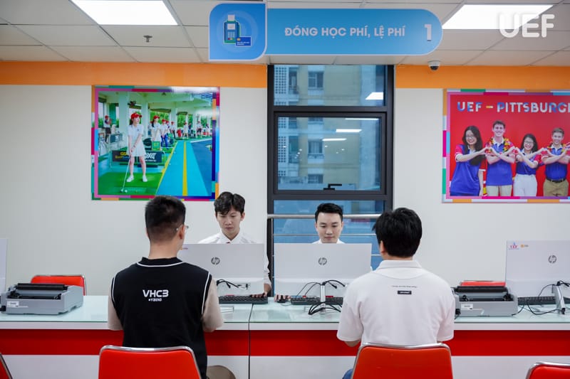 Đối với thí sinh học chương trình liên kết quốc tế sẽ đến Khu vực 4 (tầng 6) để nộp các loại giấy tờ trong hồ sơ nhập học theo quy định. Sau đó, làm thủ tục xếp lớp, nhận thông báo về việc cấp phát tài khoản sinh viên UEF, nhận biên nhận hồ sơ, lịch thi tiếng Anh miễn học phần (nếu có).
