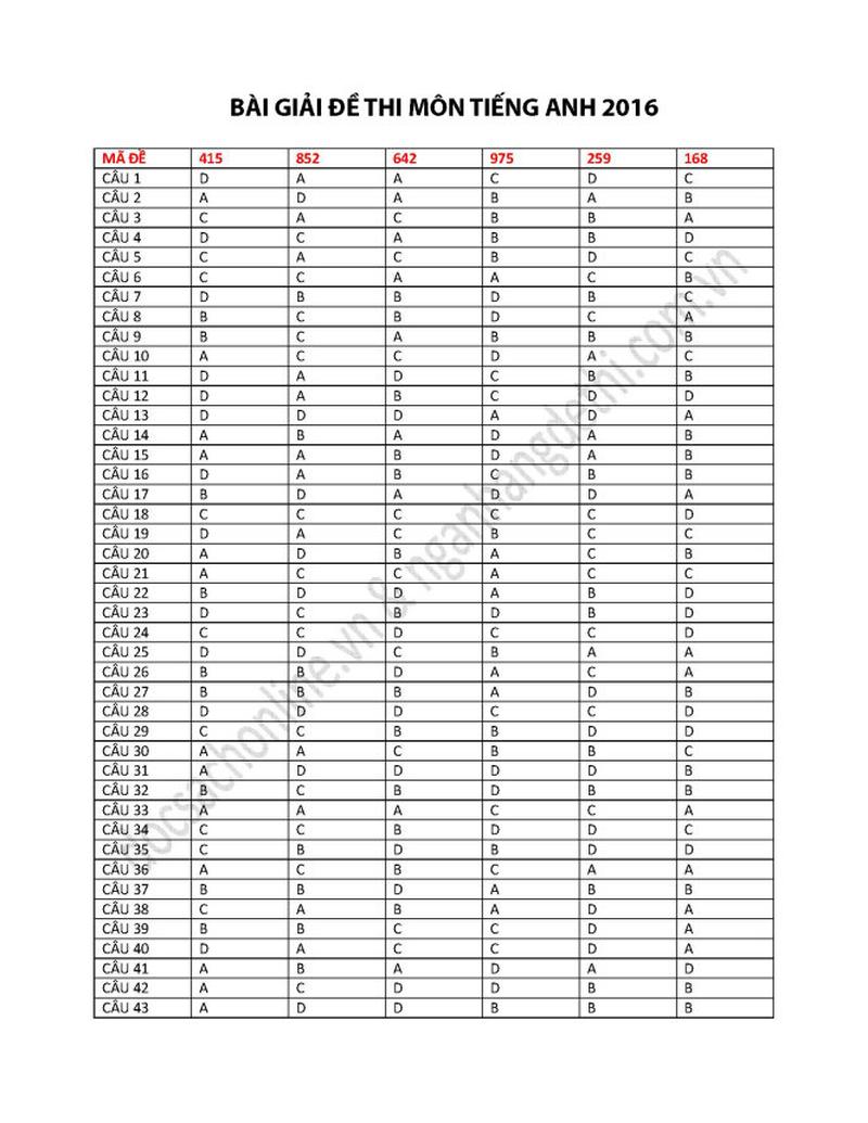 > Đáp án chính thức của môn tiếng Anh - kỳ thi THPT Quốc gia 2016