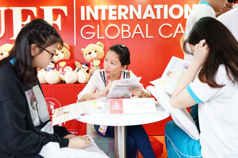 Tham quan gian hàng UEF, các thí sinh và phụ huynh đã được đội ngũ giảng viên và tư vấn viên nhiệt tình giải đáp thắc mắc, đặc biệt là các phương thức xét tuyển, chính sách học phí, học bổng, cơ hội việc làm, các thế mạnh khác của trường: môi trường học tập, các hoạt động giao lưu quốc tế, học tập kỹ năng, câu lạc bộ,...