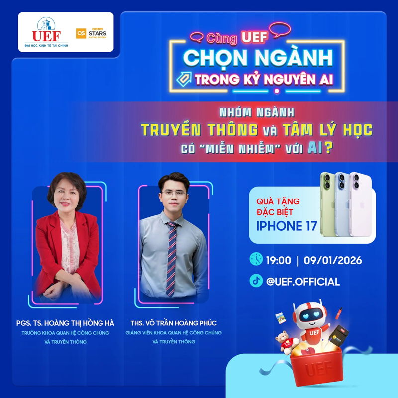 Trước những băn khoăn đó, tối ngày 9/1, UEF đã cho lên sóng phiên livestream tư vấn trên nền tảng TikTok với chủ đề “Nhóm ngành Truyền thông và Tâm lý học có ‘miễn nhiễm’ với AI?”, thuộc series “Cùng UEF chọn ngành trong kỷ nguyên AI”, mang đến nhiều thông tin giá trị cho các bạn học sinh, đặc biệt là team 2k8 đang trong giai đoạn định hướng ngành nghề.