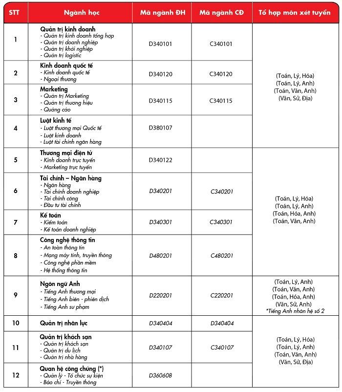 Các ngành đào tạo và tổ hợp môn xét tuyển tương ứng tại UEF năm 2016