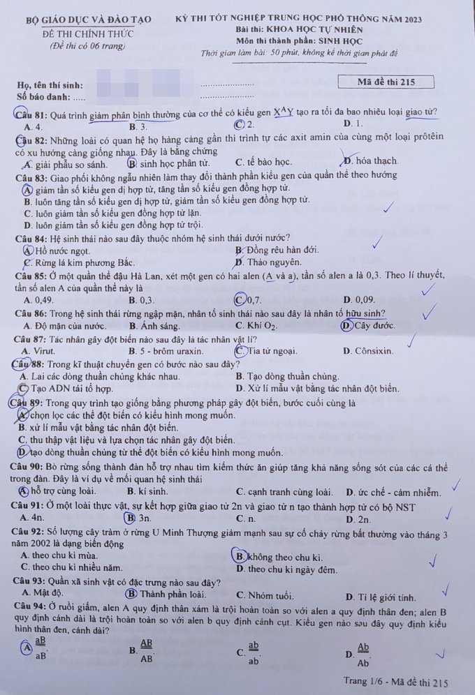 9g35 sáng 29/6, thí sinh dự thi Kỳ thi tốt nghiệp THPT 2023 đã tiến hành làm bài môn Sinh học - môn thi thành phần cuối cùng của bài thi tổ hợp Khoa học tự nhiên. Thời gian làm bài là 50 phút, hình thức thi trắc nghiệm.