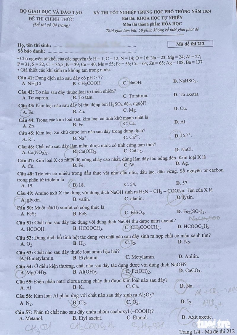> Đề thi môn Hóa học - kỳ thi tốt nghiệp THPT 2024