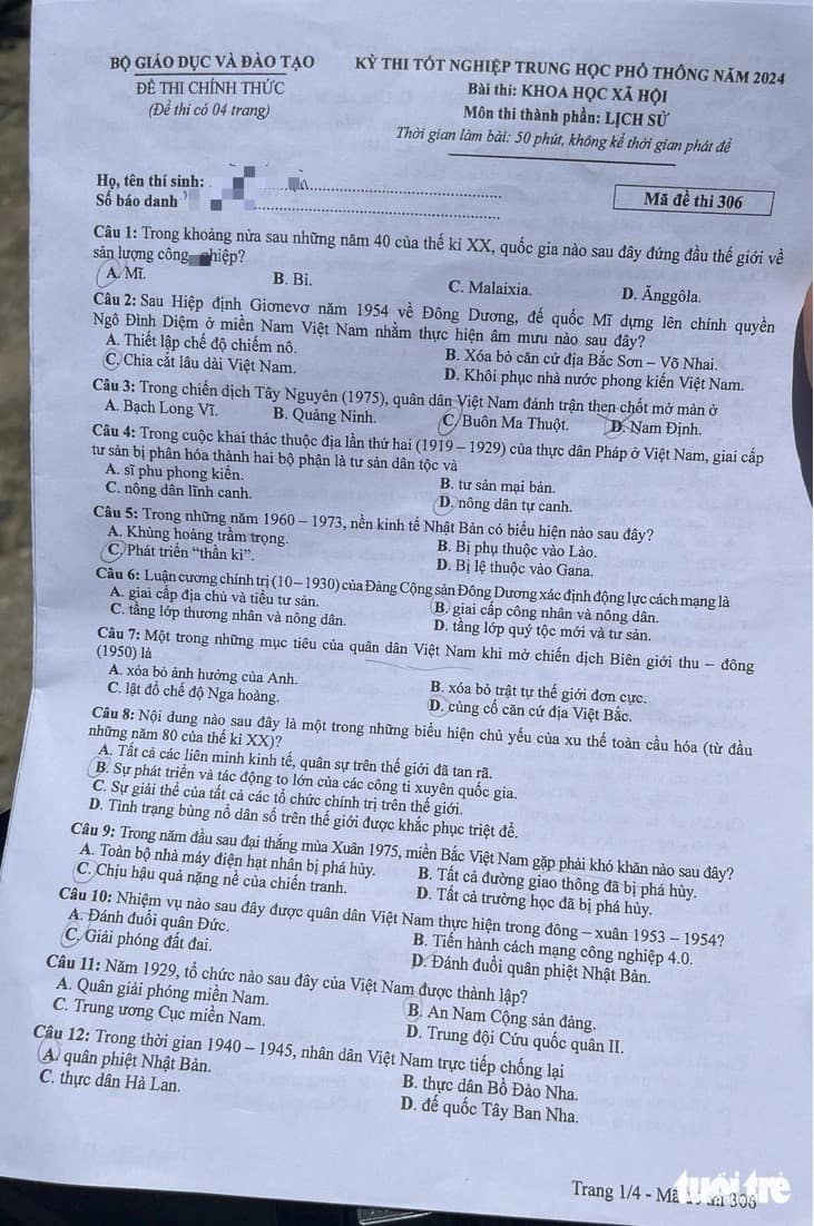 > Đề thi môn Lịch sử - kỳ thi tốt nghiệp THPT 2024