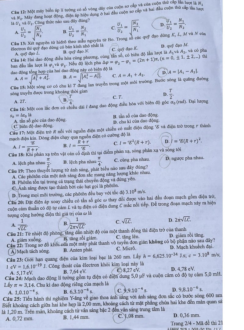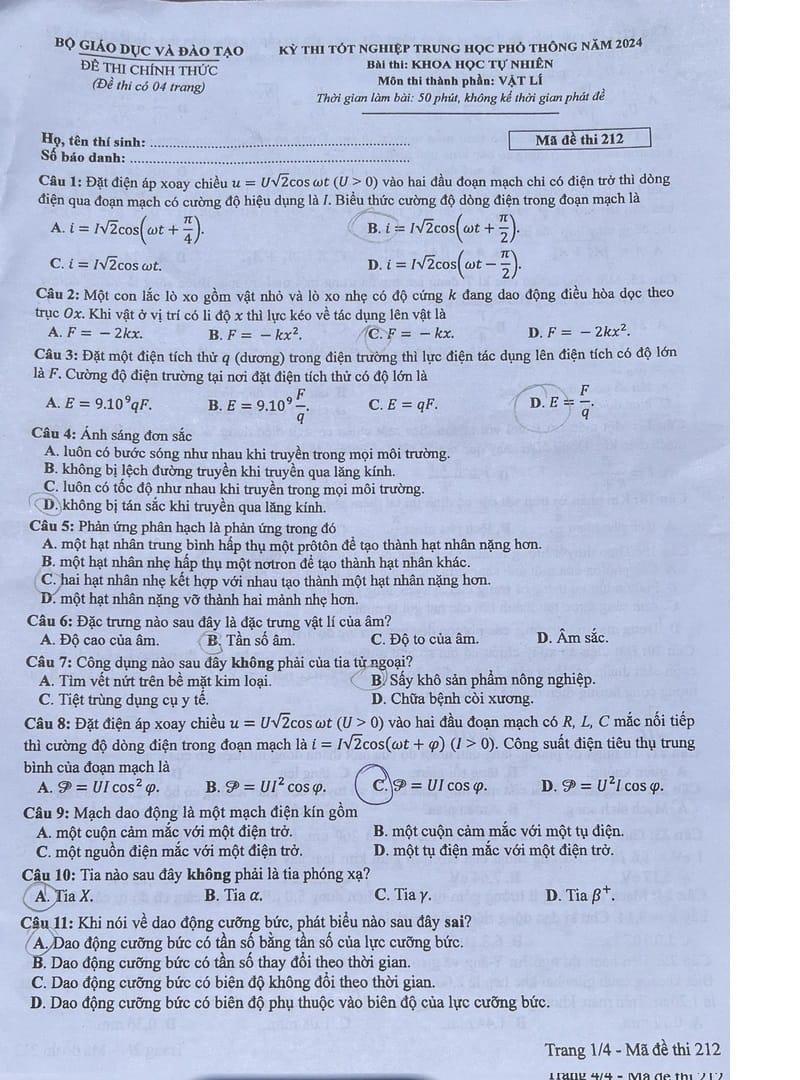 > Đề thi môn Vật lý - kỳ thi tốt nghiệp THPT 2024
