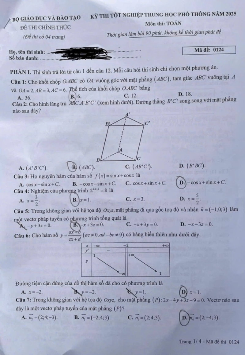 > Đề thi môn Toán - kỳ thi tốt nghiệp THPT 2025
