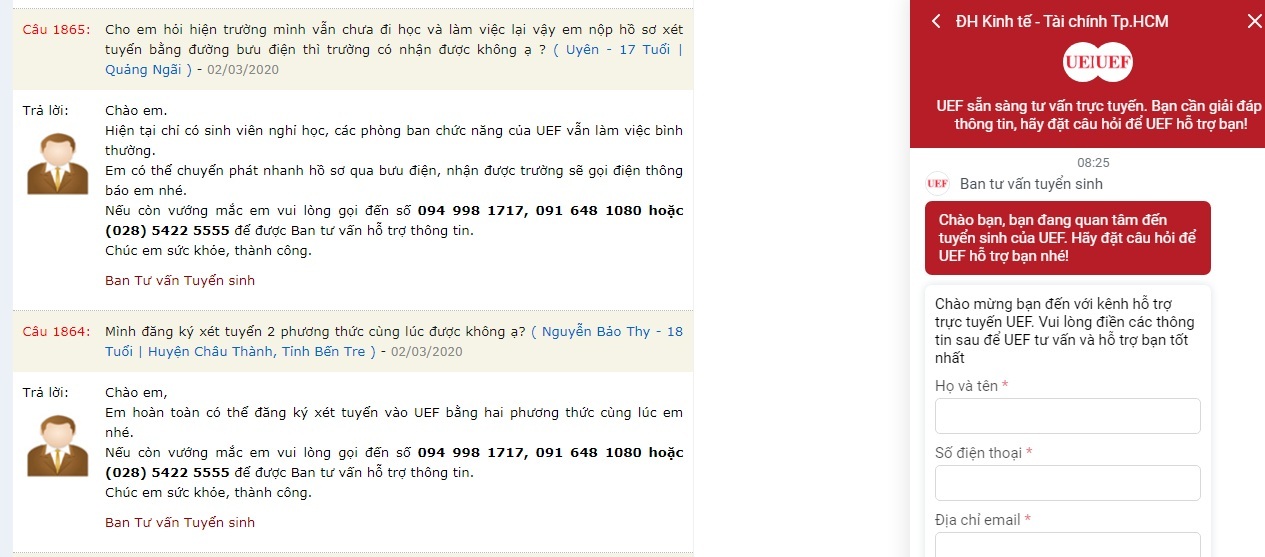 Trang tư vấn trực tuyến của UEF tiếp nhận rất nhiều câu hỏi của thí sinh