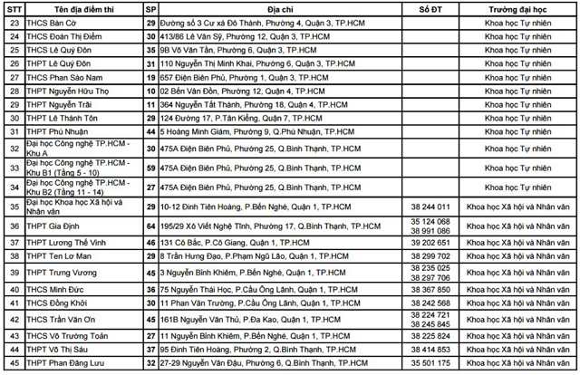 Năm nay, TP Hồ Chí Minh có 4 cụm thi do ĐH Bách khoa TP HCM, ĐH Khoa học Tự nhiên, ĐH Khoa học Xã hội & Nhân văn TP HCM và ĐH Sư phạm TP HCM chủ trì.