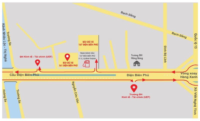 Việc di chuyển đến trụ sở 141, các bạn có thể sử dụng các phương tiện công cộng thân thiện môi trường như xe buýt. Bên cạnh đó, ngoài các tầng hầm giữ xe của trường, xung quanh trường có các bãi xe 161 Điện Biên Phủ, 167 Điện Biên Phủ (Bãi xe Cây xăng - cách trường khoảng 170m).