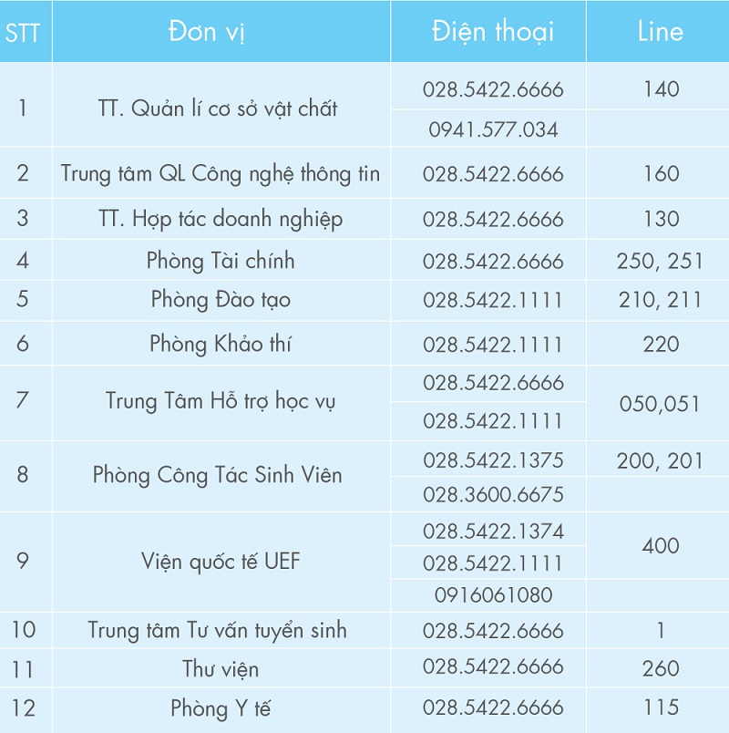 Số điện thoại liên hệ các khoa, phòng, trung tâm, viện của UEF
