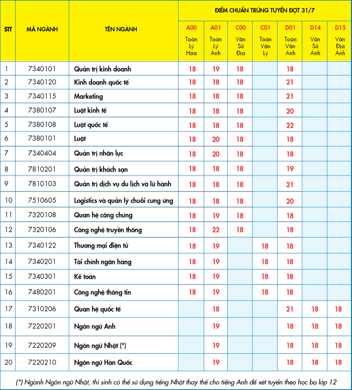 1. Điểm chuẩn trúng tuyển học bạ đợt 31/7