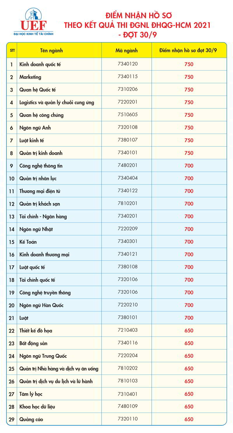 Mức điểm trúng tuyển theo phương thức xét kết quả thi Đánh giá năng lực Đại học Quốc gia TP.HCM tại UEF đợt 20/9 cao nhất vẫn là 750 ở các ngành Kinh doanh quốc tế, Quan hệ quốc tế, Luật quốc tế; các ngành Quản trị kinh doanh, Logistics và Quản lý chuỗi cung ứng, Ngôn ngữ Hàn Quốc có mức điểm trúng tuyển là 700, 23 ngành còn lại có mức điểm trúng tuyển là 650, chi tiết như sau: