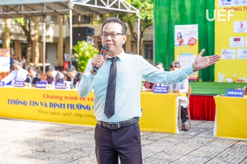 ThS. Nguyễn Ngọc Thạch - Phó Giám đốc Trung tâm Tư vấn - Tuyển sinh UEF, đã giới thiệu đến các bạn học sinh mô hình đào tạo gắn liền thực tiễn và công nghệ AI mà UEF đang triển khai, giúp sinh viên không chỉ vững kiến thức mà còn sẵn sàng thích ứng với môi trường nghề nghiệp hiện đại. Đồng thời, thầy cũng thông tin đến học sinh về chính sách học bổng sớm dành cho thí sinh đăng ký bằng học bạ lớp 11, mang đến cơ hội học tập và phát triển tại một môi trường đại học năng động, chuẩn quốc tế.