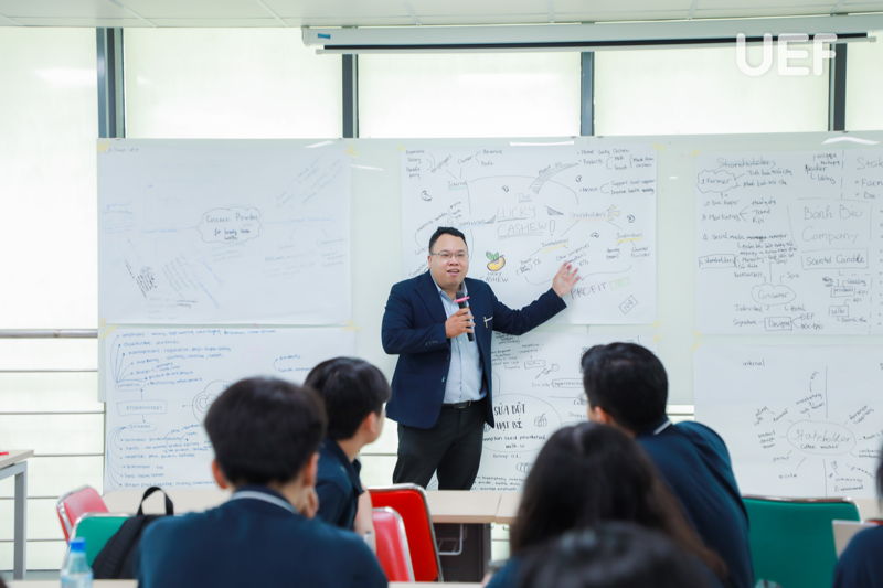 Ngay sau chương trình khai mạc diễn ra vào sáng ngày 4/11, lớp học dành riêng cho học sinh ngành Quản trị kinh doanh cũng bắt đầu. Những bước khởi động đầu tiên khá nhẹ nhàng và đơn giản, chủ yếu để các bạn học sinh làm quen với Khoa Quản trị kinh doanh, với thầy cô Nhà UEF. Sau đó là những chuyên đề thú vị, giúp học sinh Vinschool có góc nhìn sâu sắc hơn về ngành nghề mà các bạn quan tâm.