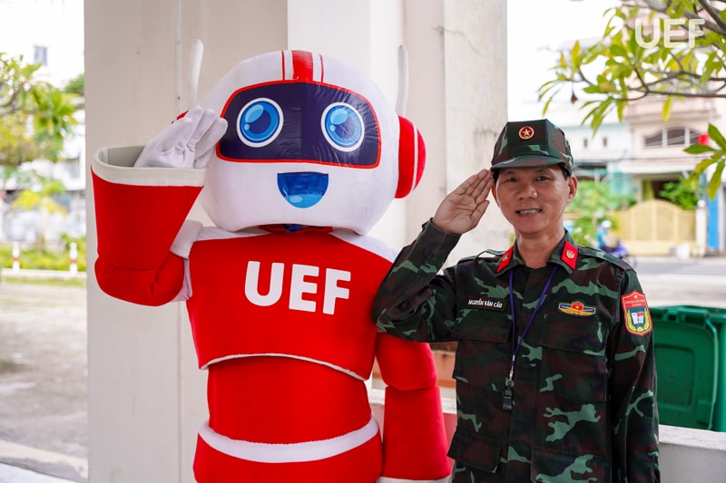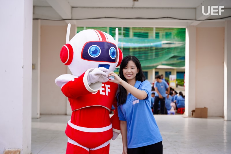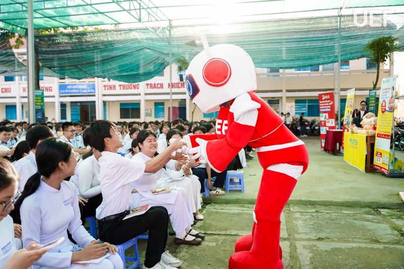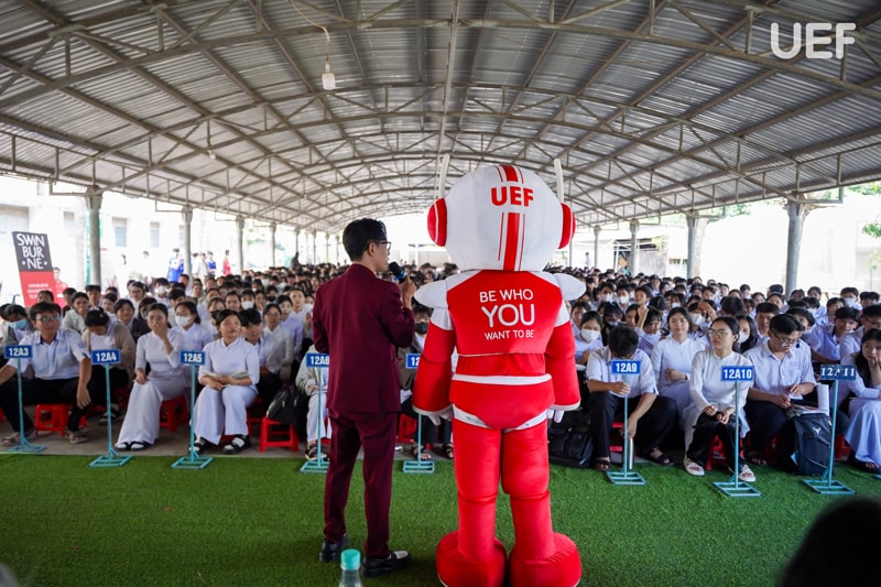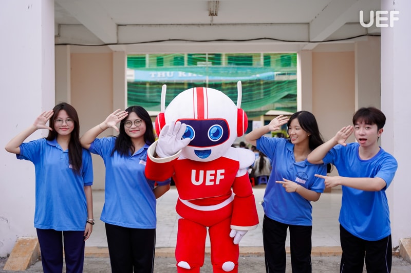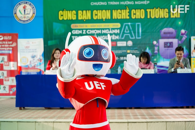 Điểm nhấn đặc biệt trong chương trình hướng nghiệp lần này chính là sự xuất hiện của Mascot Robot AI UEF. Đây là biểu tượng công nghệ đầy sức sống, đại diện cho tinh thần trẻ trung, sáng tạo và hội nhập trong định hướng đào tạo Nhà trường. Với diện mạo đáng yêu, dáng vẻ linh hoạt cùng phong cách “chuẩn Gen Z”, Robot AI đã nhanh chóng “chiếm spotlight” ngay từ khi xuất hiện tại các trường THPT.