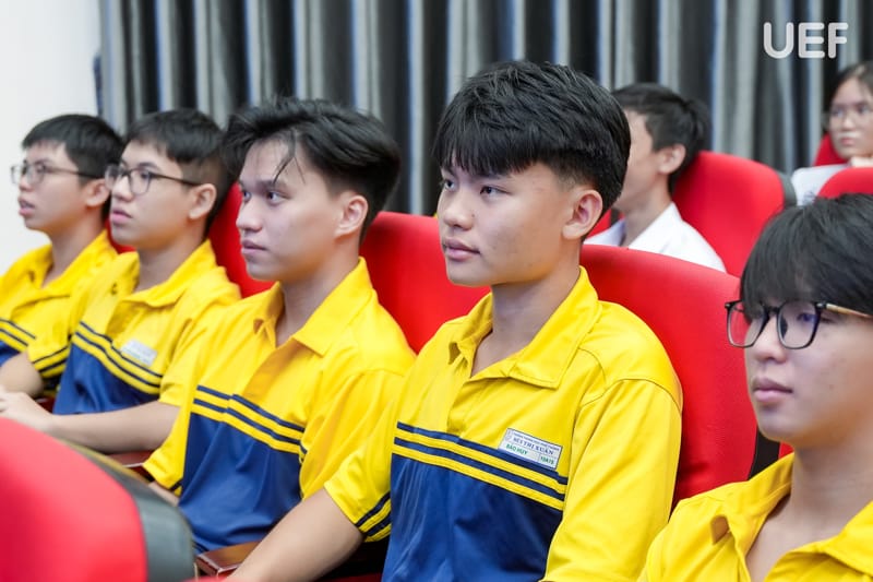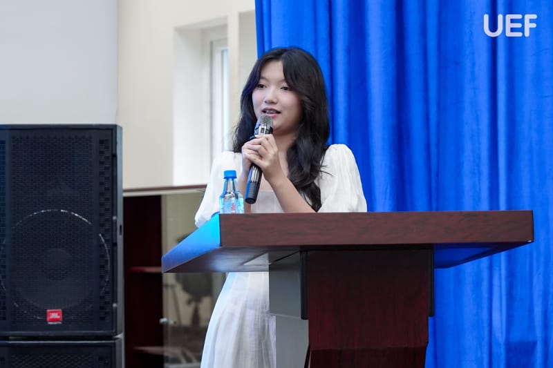 Học sinh Lê Ngọc Cát Tường - Lớp 11A17 chia sẻ tại chương trình: “Sự hợp tác này mang đến cơ hội lớn cho chúng em khi được tham gia khóa học ý nghĩa từ trường UEF. Từ đây mở ra chân trời mới, không gian mới để thực hiện mục tiêu vươn ra toàn cầu”.