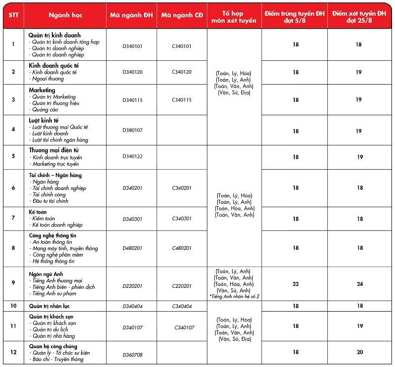 • Trình độ đại học: 18 điểm cho tất cả các ngành (riêng ngành Ngôn ngữ Anh: 22 điểm sau khi nhân hệ số môn tiếng Anh)