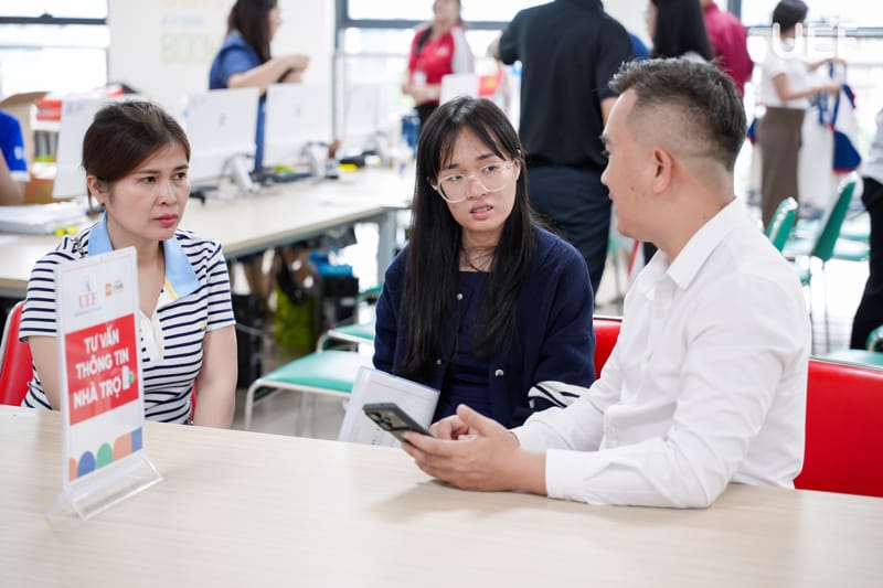 Đội ngũ tư vấn tuyển sinh và cán bộ hỗ trợ của UEF đã có mặt từ rất sớm để chuẩn bị công tác tiếp đón. Các bàn hướng dẫn được bố trí khoa học, giúp thí sinh dễ dàng nắm bắt quy trình.
