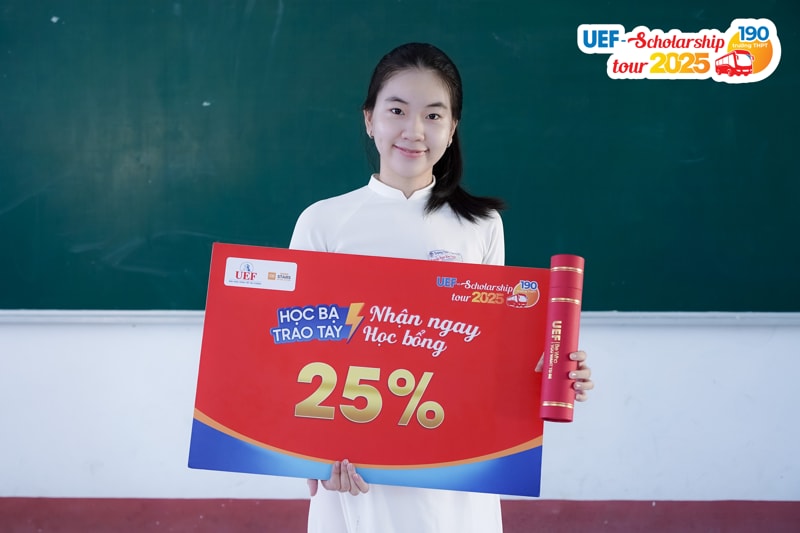 Bạn Nguyễn Ngọc Kim Ngân (12A2), Trường THPT Tân Hiệp là người có chủ đích đăng ký học bổng từ đầu cũng đã chính thức nhận được học bổng 25% của UEF cho ngành Kinh tế quốc tế. “Em cảm thấy nhẹ lòng vì giờ đã có thêm cơ hội lựa chọn trường đại học phù hợp với mình, không còn áp lực quá nhiều khi đứng trước ngưỡng cửa thi cử”.