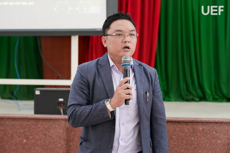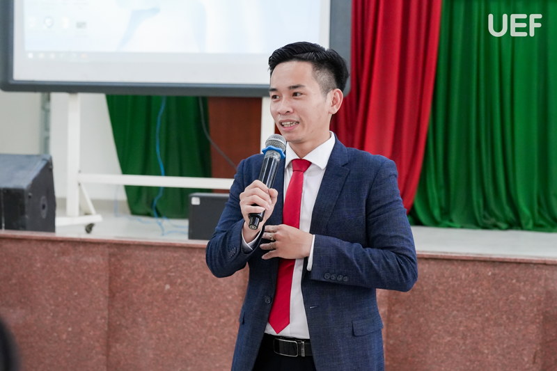 Mở đầu chương trình, ThS. Trần Quốc Bảo đã giới thiệu tổng quan về môi trường học tập tại UEF, từ chương trình đào tạo gắn kết thực tiễn, điều kiện học tập hiện đại đến hệ sinh thái hoạt động hỗ trợ sinh viên. Thầy cũng chia sẻ những phương thức tuyển sinh dự kiến cho năm học mới và các chính sách học bổng dành cho học sinh THPT, giúp các bạn có thêm cơ sở để lựa chọn ngành nghề phù hợp với năng lực và sở thích.
