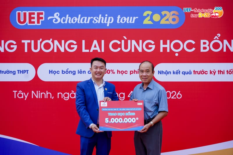 Sáng ngày 20/4, chuyến xe UEF Scholarship Tour 2026 tiếp tục lăn bánh đến tỉnh Tây Ninh (Long An cũ) và dừng chân tại Trường THPT Võ Văn Tần. UEF đã trao tặng 22 suất học bổng sớm cho học sinh lớp 12, đồng thời mang đến nhiều thông tin hữu ích về định hướng nghề nghiệp và tuyển sinh đại học.